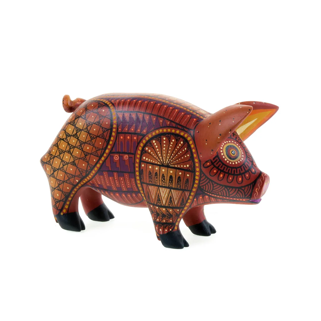 Pig alebrije wood carving by the very talented Roque family. Handcrafted out of a single piece of copal wood and painted with very fine detail at their workshop in Oaxaca.