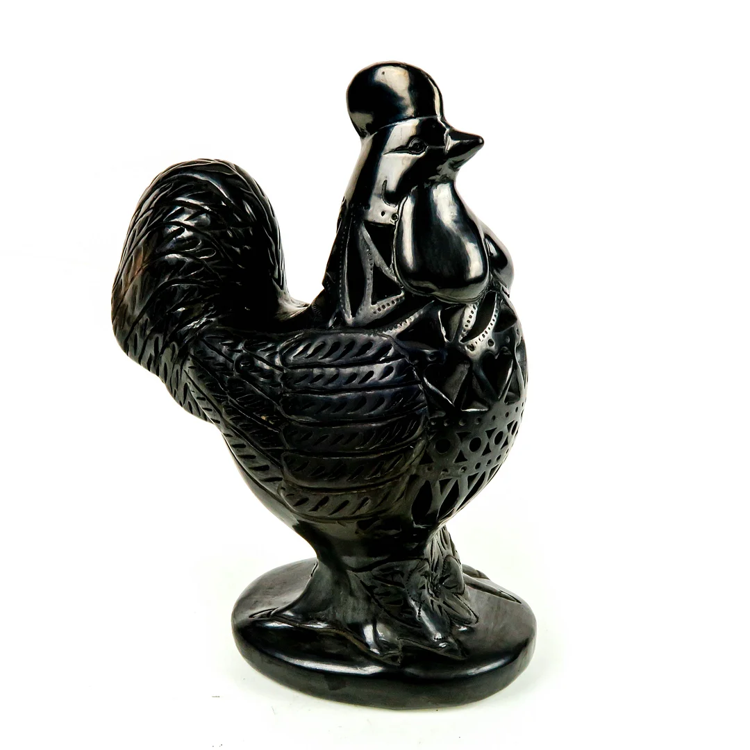 Mexican barro negro sculpture from the Doña Rosa family workshop ."Barro negro" translates from Spanish to "black clay". This clay is found in only one place in the world- San Bartolo Coyotepec in Oaxaca. Here, the clay is excavated from the ground, molded, and pit fired. Its glossy finish is achieved by polishing the clay with quartz stone before firing. This technique was invented and perfected by Doña Rosa, a ceramics artisan, in the 1950's at her workshop in Oaxaca, Mexico. The polishing of the clay compresses the surface which along with being fired at a lower temperature results in the shiny black surface we see in all barro negro pieces. A normally fired ceramic piece using the same clay would instead result in a dull gray finish. All craftsmanship is done by hand using only natural materials.