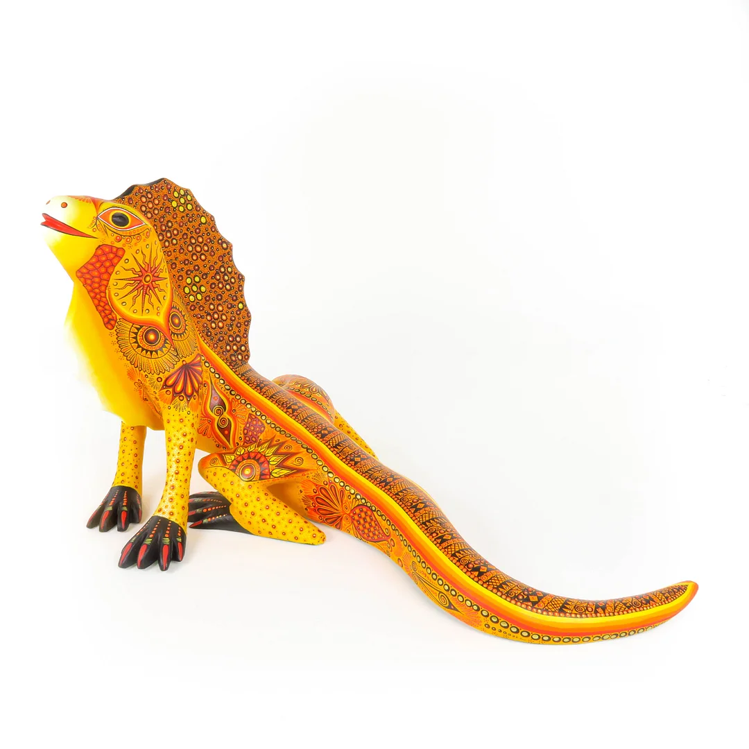 Exceptional iguana by the Sosa family. Handcrafted out of a single large piece of copal wood and painted with exceptional detail and bright colors that the Sosa is so well known for. The unique design is inspired by the ancient Zapotec patterns that can be found throughout archaeological ruins found throughout Oaxaca.