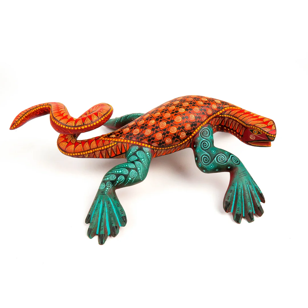Beautiful Zapotec iguana alebrije wood carving by award winning artists Nestor Melchor & Leticia Fabian. Delicately carved out of a single piece of copal wood by Nestor and painted by his wife with very fine detail. Includes signed certificate of authenticity.