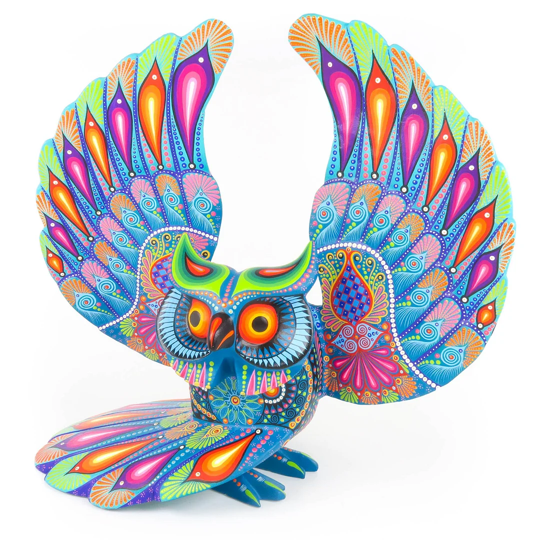 Beautiful one-piece owl alebrije wood carving by the Sosa family. Handcrafted out of a single piece of copal wood at their workshop and painted with very fine detail. The Zapotec patterns are absolutely captivating and the colors really make this piece stand out. A very well done piece by some of the best Mexican artists.