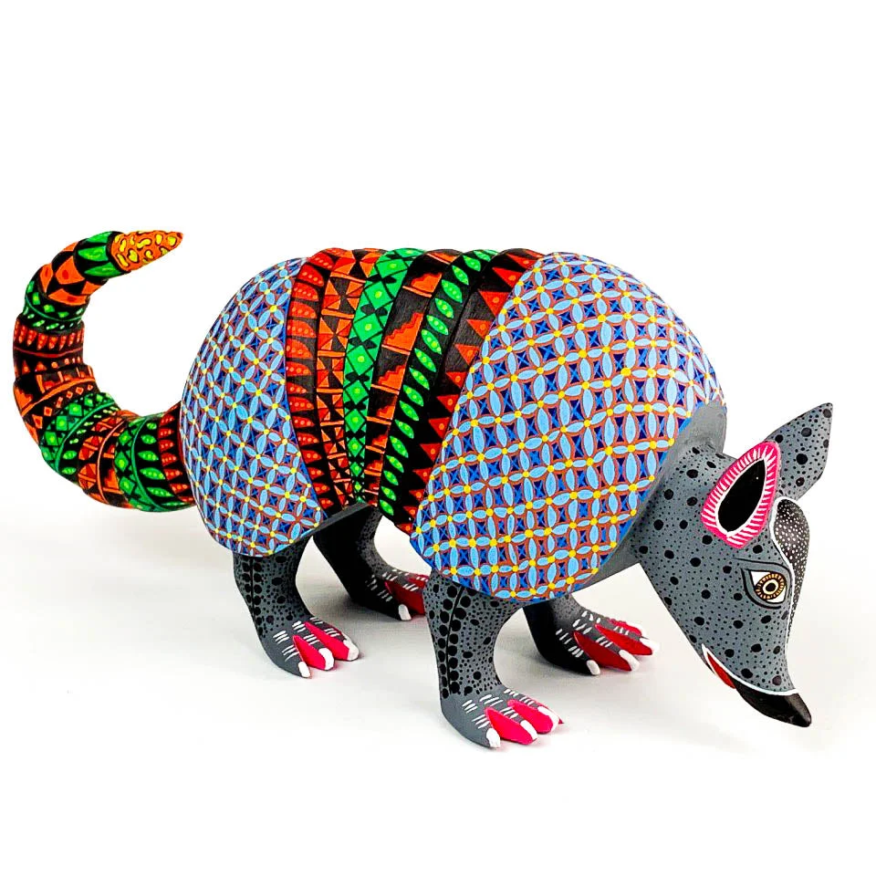 Fantastic armadillo alebrije wood carving handcrafted by the Ramirez family workshop in Oaxaca, Mexico. Masterfully carved out of copal wood (a native and sustainably sourced wood in Oaxaca). The Ramirez family is known for their vibrant painting style that incorporates ancient Zapotec patterns in their designs.