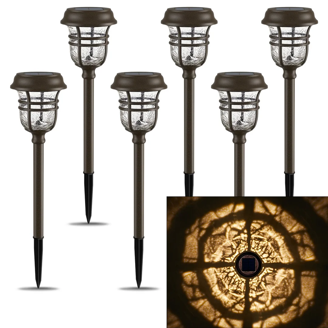 🌈Attractive Pattern&Unique Design Solar Lights Outdoor: Serviceable Anti-Rust coated stainless steel material, monocrystalline silicon, Brushed bronze-finished stainless steel body, crackled glass lampshade, upgraded robust ABS plastic sturdy spikes design with convenient adjustable switch. Attractive decoration choice with advanced cracked style glass lampshade for unique and elegant design to blend into surounding easily. Warm white is suitable for daily lighting; another mode suitable for festival decoration, excellent lighting design greatly meets your different lighting and decoration needs, such as Halloween and Christmas.
